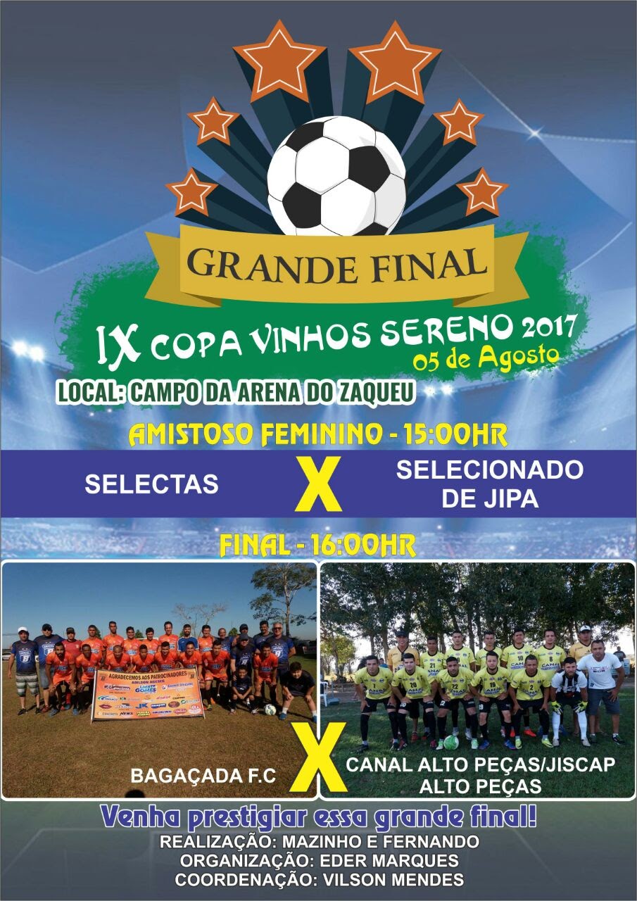 A decisão da 9ª Copa Vinhos Sereno de Futebol Society 2017, acontece na tarde deste sábado 05/08 a partir das 15:00 nas quadras do Arena Sport do Zaqueu de Ji-Paraná.