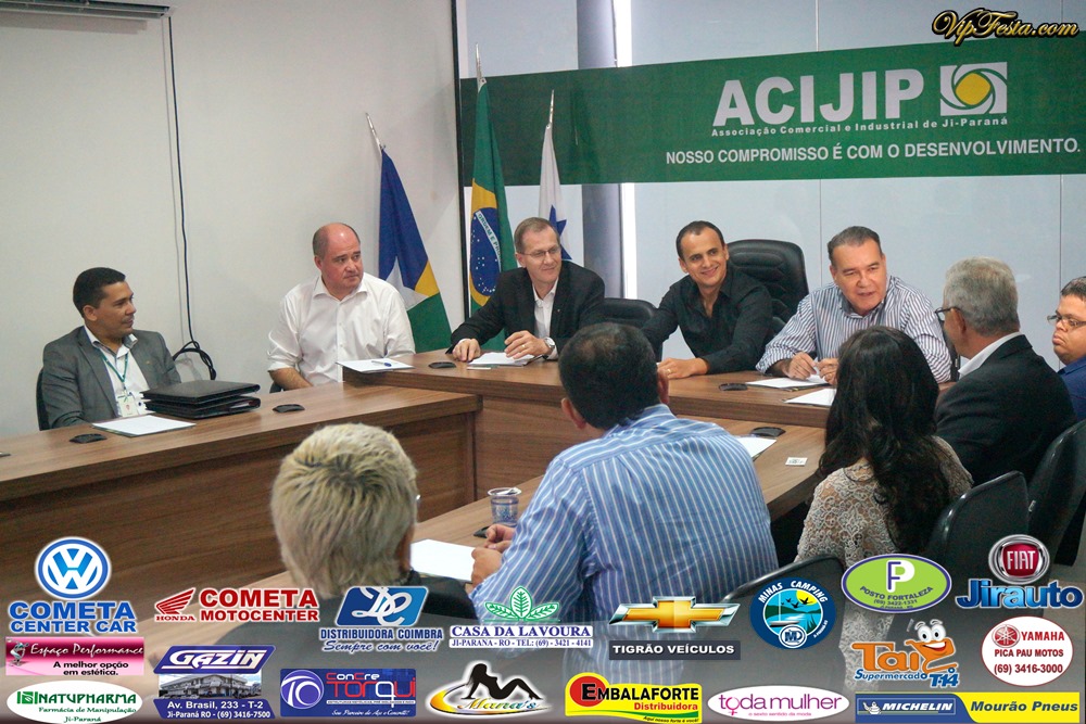 Reunião na sede da Associação Comercial e Industrial de Ji-Paraná (ACIJIP), com a participação do Presidente Nacional do Basa, Valmir Pedro Rossi, o Diretor Nacional Wilson Evaristo, o Superintendente Edimar Bernardino e o gerente da Agência do Basa de Ji-Paraná Jonas Bassay, com a participação de empresários da cidade, Prefeito e Vice de Ji-Paraná Jesualdo Pires e Marcito Pinto, Presidente da Acijip Hugo Araújo.